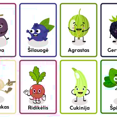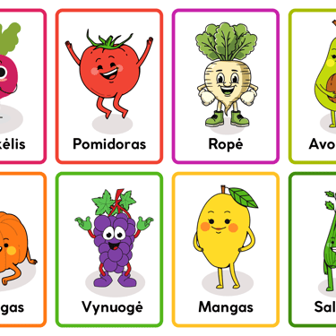Pristatome jums spalvotas vaisių-daržovių korteles, kurios puikiai tinka mokymuisi, žaidimams ir kūrybiniams projektams.